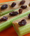 Wash celery sticks. Spread peanut butter on to a celery stick and top with raisins.